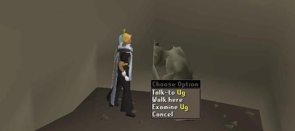 To start the quest speak to Ug who can be found downstairs in the troll stronghold, to get to him enter the stronghold and run south then go down the stairs you find here into the area with the cook. From here take the northwest passageway and head slightly north until you see a room with Ug in the southern area of it. Enter the room and speak to Ug to find out why he is upset, he will tell you that he wants to earn Aga's love. You will discover that Aga is in love with a really powerful troll called Arrg.