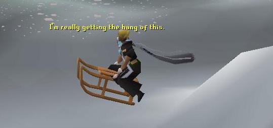 Now, equip your sled and click on the slope to slide down it, you will eventually end up in a really icy area.