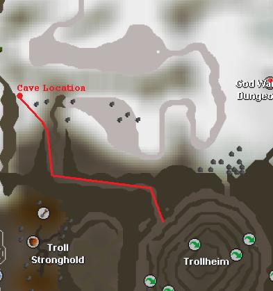 Return to Trollheim, and take the north-west path located west of the maze and directly north of the path leading to the Troll Stronghold. Follow the path until you see an Icy Gate, however ignore this and continue north then west. The map below will show you how to find the cave.