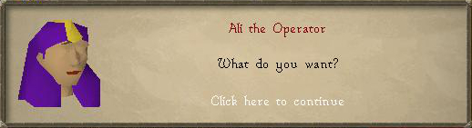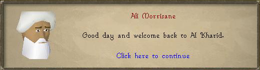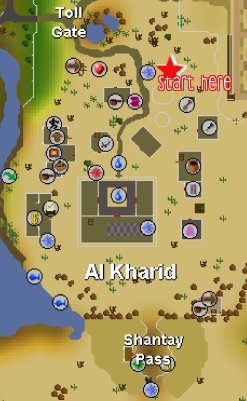 1. Talk to Ali Morrisane, located in Al Kharid (North-east corner, near the Quest symbol on your mini-map).