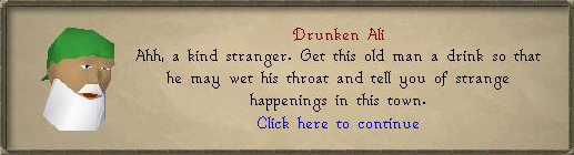 6. Talk to Drunken Ali in the bar and ask him for some information regarding Ali Morrisane's nephew. Drunken Ali will give you a little information and then ask for a beer. Right-click the beer in your inventory and use it on him. He'll tell you some more info and then ask for another beer. Keep doing this until you've given him all 3 mugs of beer. Drunken Ali will then finally tell you he suspects the disappearance of the nephew is linked to the gangs.