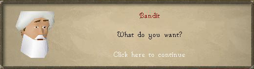 31. Go north where the rug merchant is. You'll find the Bandit Leader there. Tell him to leave town or else. He refuses and summons a Bandit Champion (Level 70) to fight you.