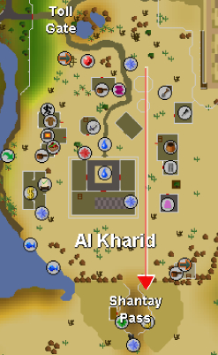 3. Now go south to the Shantay Pass and purchase a pass if you don't have one. If you don't already have the desert robe and desert top, or the waterskins, you can also purchase them here.