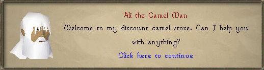 9. Now go to the discount camel store (located in the western part of town) and ask to buy 2 camels from Ali the Camel Man. First offer him 500 coins. If that doesn't work, offer 1,000 coins. He'll then provide you with 2 camel receipts.