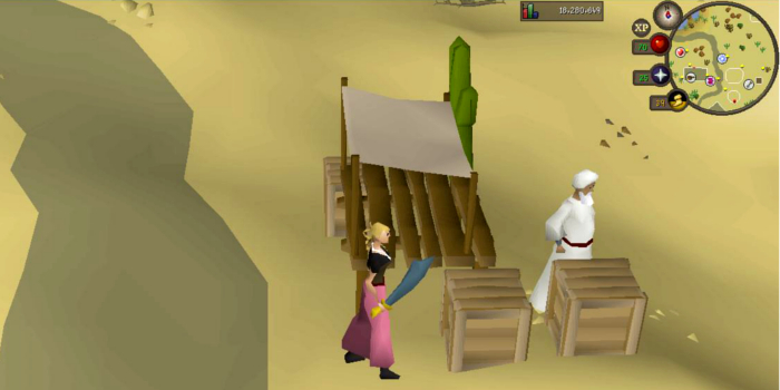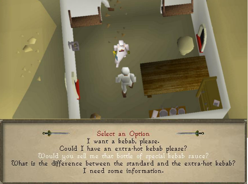 23. Go down the hill and into the kebab store. Talk to Ali the Kebab Seller and ask for his special hot sauce. Once you have that, go back to the camel store.