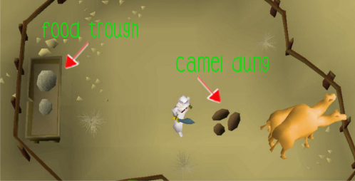 24. Use your hot sauce on the food trough. Now wait a few seconds. The camels will then produce some brown dung. Use your Bucket and scoop it up.