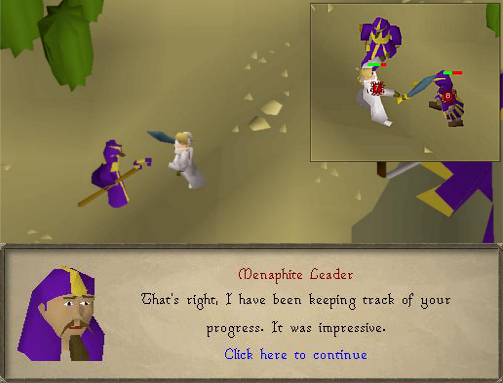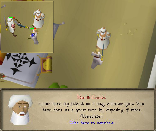30. Once you've defeated the level 75, go talk to any of the villagers (found around the center of the town). You'll find out that they are angry with you for tipping the balance of power between the Menophites and the Bandits. They'll ask you to fix it.