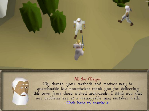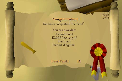 34. Return to Al Kharid by either using the carpet ride or by running back north. Once you're back, speak to Ali Morrisane again at his stall and he'll reward you for your troubles. Congratulations, you've finished The Feud [: