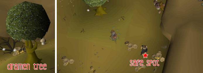 (b) Ranged + Magic -- You can stand in the safe spot to attack. There is a safe spot south of the Dramen tree, between three mushrooms.