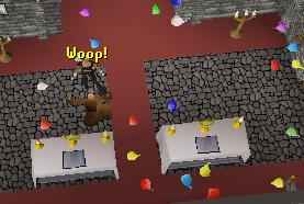 Exit the monastery after speaking to Brother Omad and head north towards Ardougne, you will find Brother Cerdric hungover and his cart broken. Speak to Brother Cerdric and he will request you to give him a jug of water to sober up, give him a jug of water then speak with him again, he will ask for some logs to repair his cart. After giving Brother Cerdric some logs, return to Brother Omad to join in on the party. Balloons will fall during the party, however they do not have any items inside them if they are popped.